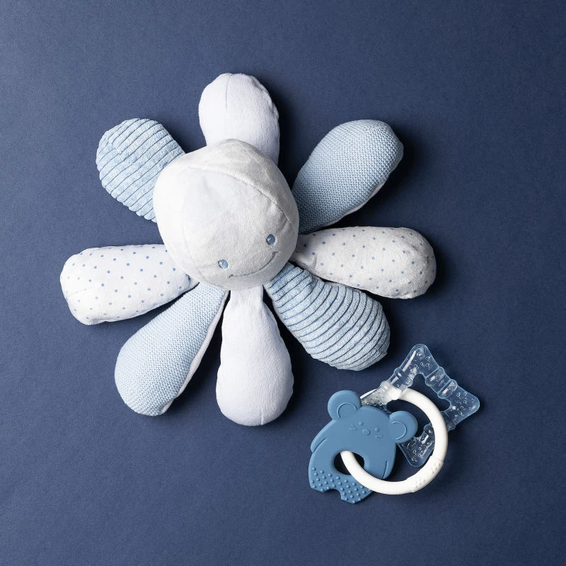 Cette jolie peluche pieuvre bleu de la marque NATTOU sera le compagnon idéal de bébé pour de tendres câlins. Une jolie peluche NATTOU toute douce à offrir sans modération.
